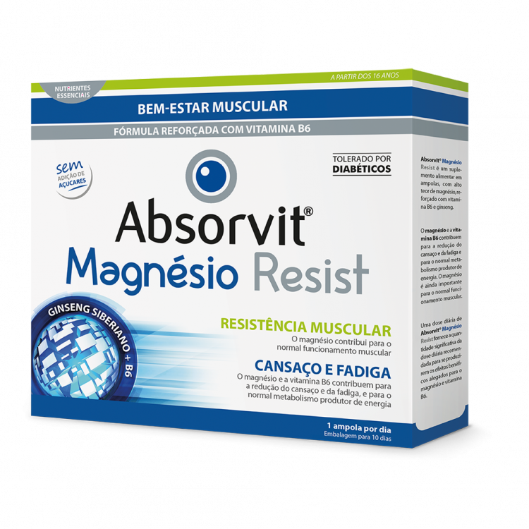 ABSORVIT® MAGNÉSIO RESIST é um suplemento alimentar, formulado em ampolas, especialmente desenvolvido para quem pratica exercício físico com regularidade. Contém ingredientes particularmente indicados na prática desportiva, como o magnésio e o ginseng siberiano. A fórmula foi ainda reforçada com vitamina B6, que tem um importante papel na redução do cansaço e da fadiga. É indicado para todas as pessoas que praticam exercício físico, para aumentar a resistência, melhorar a performance física e para ajudar na rápida recuperação pós treino/prova.