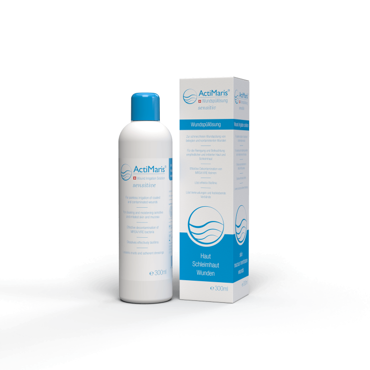 A solução para irrigação de feridas ActiMaris® Sensitive consiste em água com sal marinho (1,2%), oxiclorito NaOCl (0,04 %) e ácido hipocloroso HOCl (0,004 %). Oxiclorito (NaOCl) e sal marinho têm um efeito redutor nos patógenos típicos de feridas, sem danificar o tecido. O efeito descontaminante contra MRSA / VRE foi testado de forma positiva. O efeito oxidativo do oxiclorito e da solução hipertónica de sal marinho também são responsáveis pela neutralização dos odores das feridas.