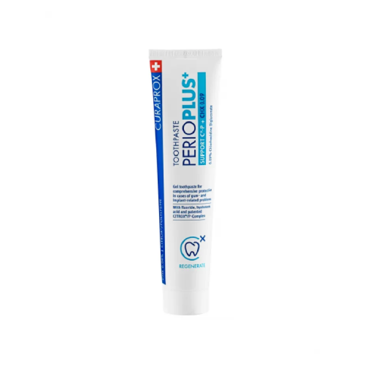 Concentração de digluconato de clorexidina: 0,09%. Também contém ácido hialurónico. A pasta de dentes Perio plus support elimina o agente espumante SLS e por isso não prejudica o efeito da clorexidina no elixir.