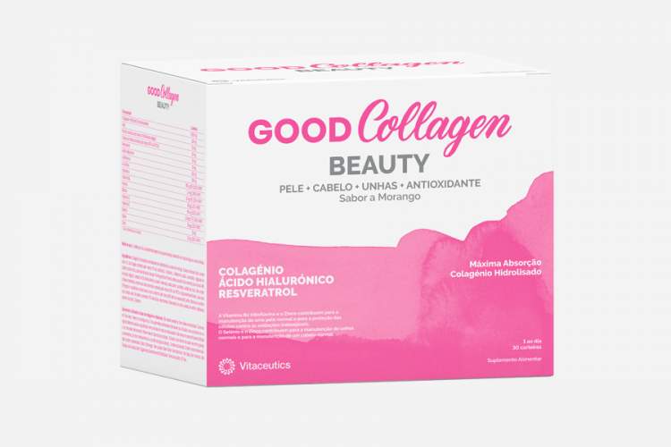 Colagénio Hidrolisado Enzimaticamente 5000 mg ; Açaí 150 mg; Romã (contendo pelo menos 40% de ácido elágico) 50 mg; Videira Vermelha (contendo pelo menos 95% de OPC’s) 20 mg; Resveratrol 10 mg; Ácido Hialurónico 10 mg; L-Metionina 100 mg; L-Cisteína 100 mg; Vitamina A 800 µg RE (100% VRN*); Vitamina B2 1,4 mg (100% VRN*); Niacina 16 mg NE (100% VRN*); Biotina 50 µg (100% VRN*); Vitamina C 80 mg (100% VRN*); Vitamina E 12 mg a-TE (100% VRN*);Selénio 55 µg (100% VRN*) Silício 15 mg; Zinco 10 mg (100% VRN*)